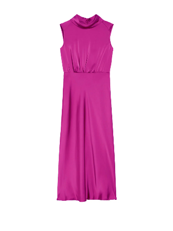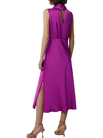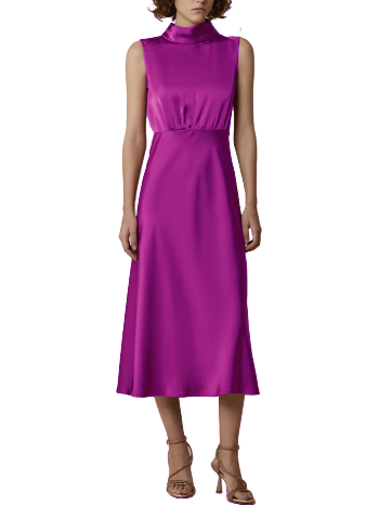 Esalta la tua eleganza con l'abito midi Alarico in raso fluido. Con taglio a vita e linee diritte che valorizzano il corpo, la gonna svasata con spacchi laterali aggiunge un tocco dinamico. Il collo alto e il dettaglio cut-out a V, insieme alla zip invisibile sul retro, rendono questo abito un must-have per le tue occasioni speciali.