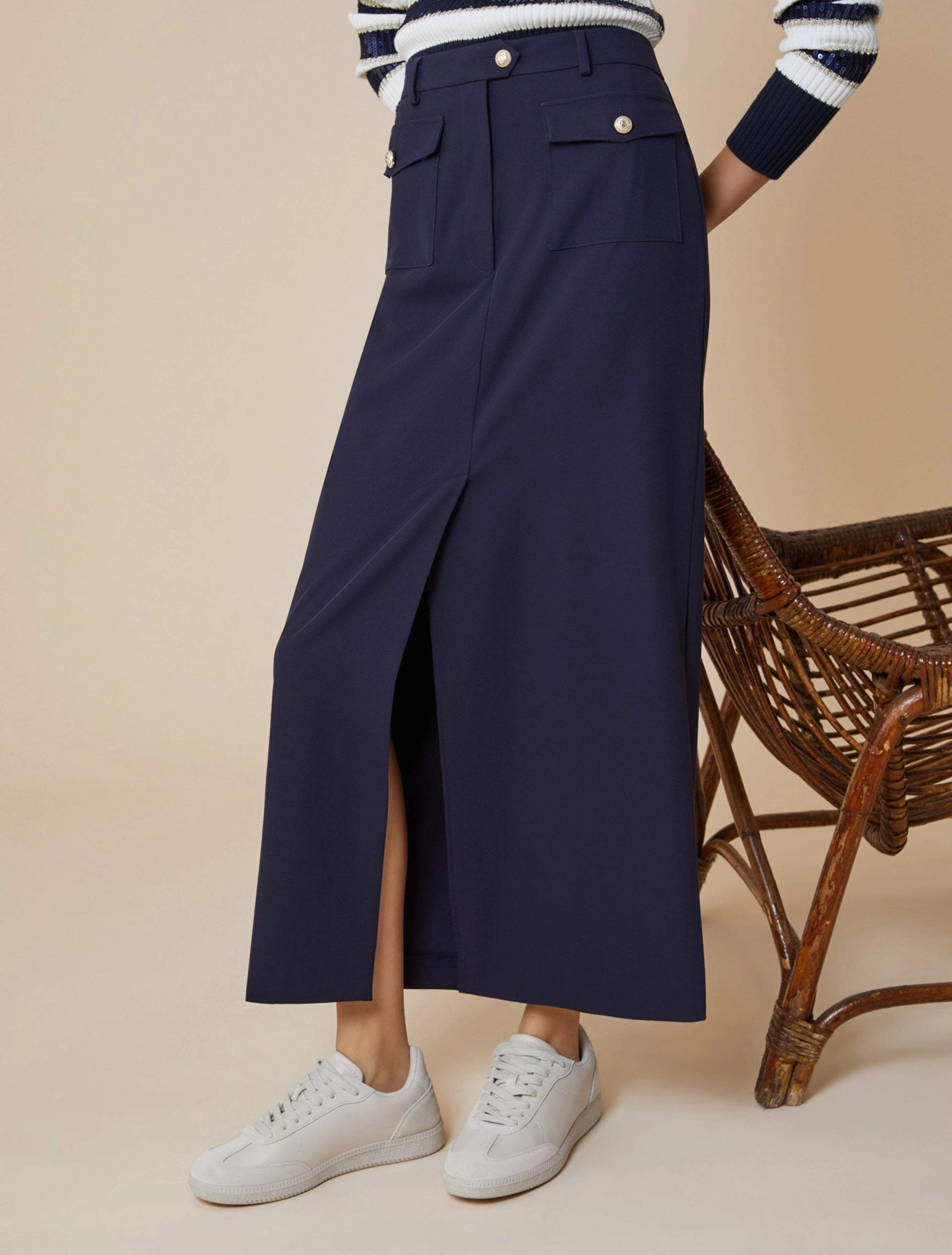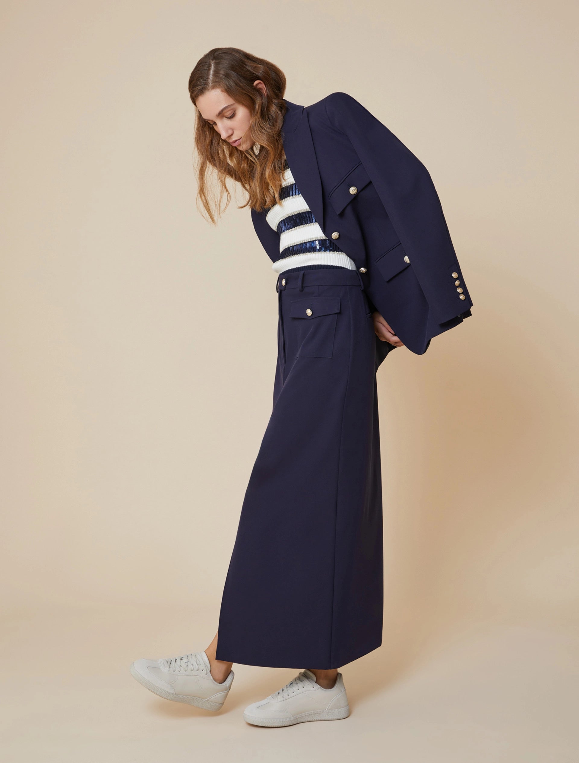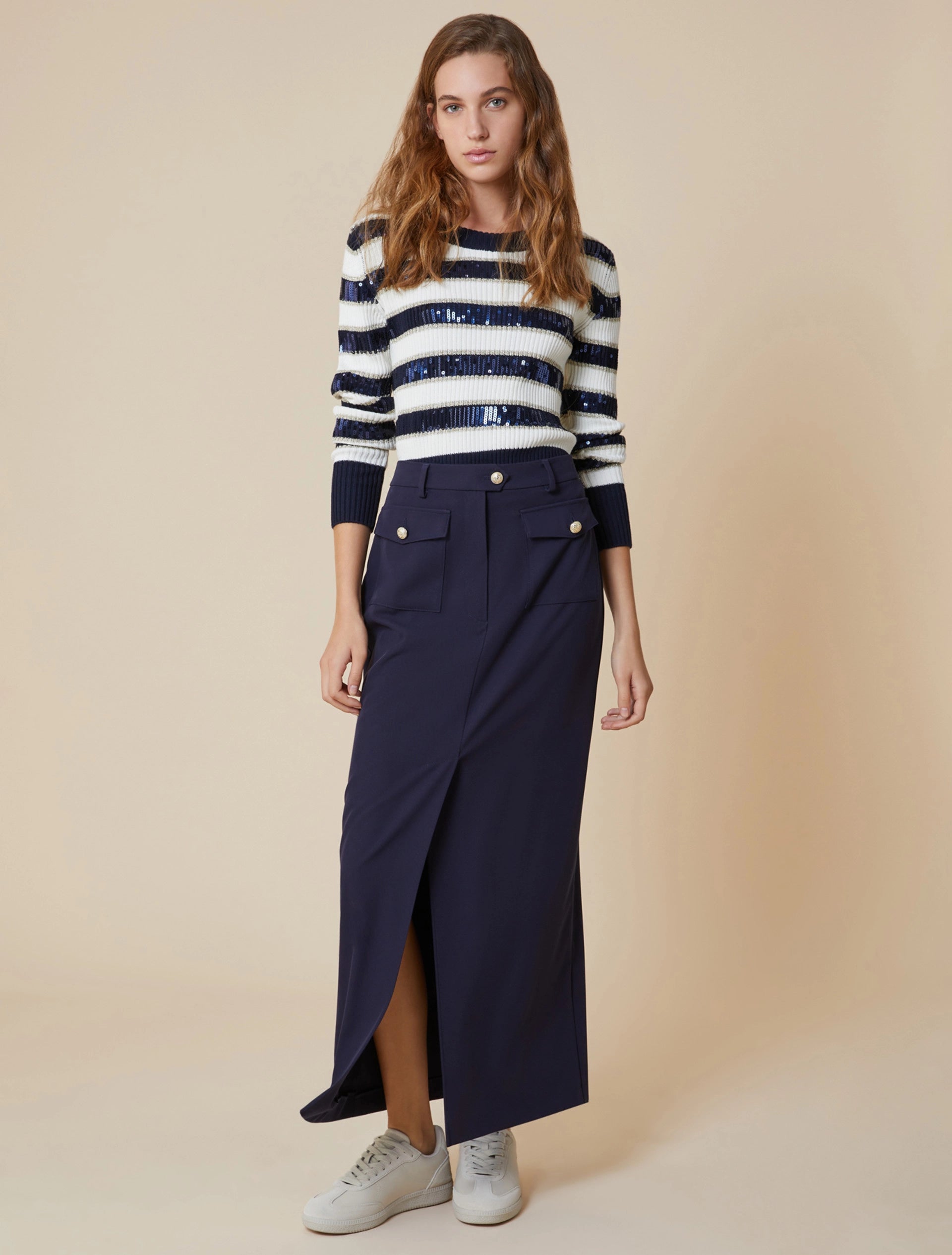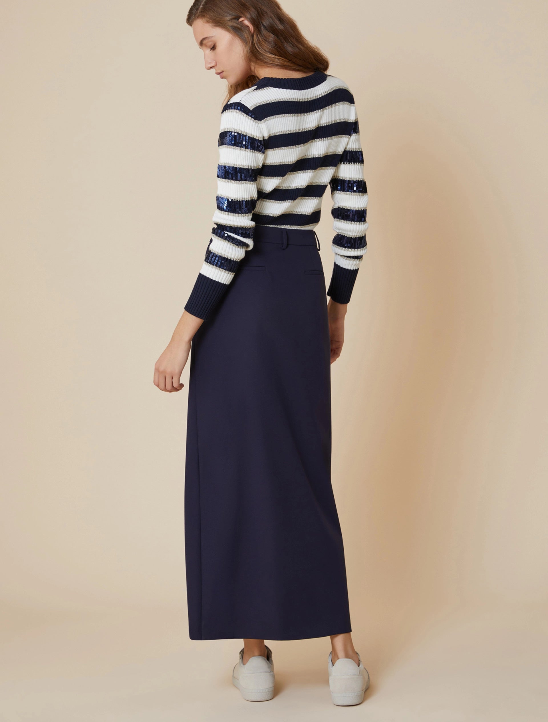 La gonna dalla silhouette femminile a colonna interpreta il classico tema marina con stile contemporaneo.