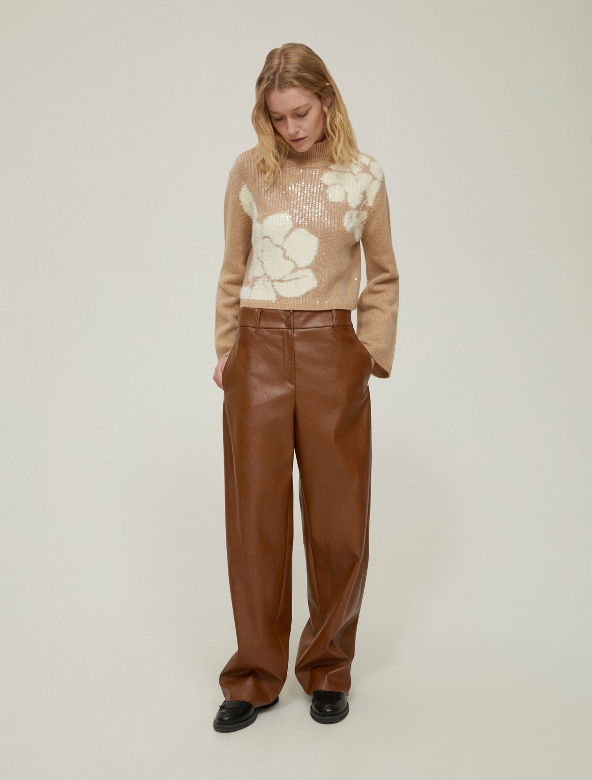 Per rischiarare e riscaldare le giornate invernali con un’abbondante dose di stile, sulla maglia dal taglio cropped sbocciano fiori soffici e si accendono riflessi luminosi.