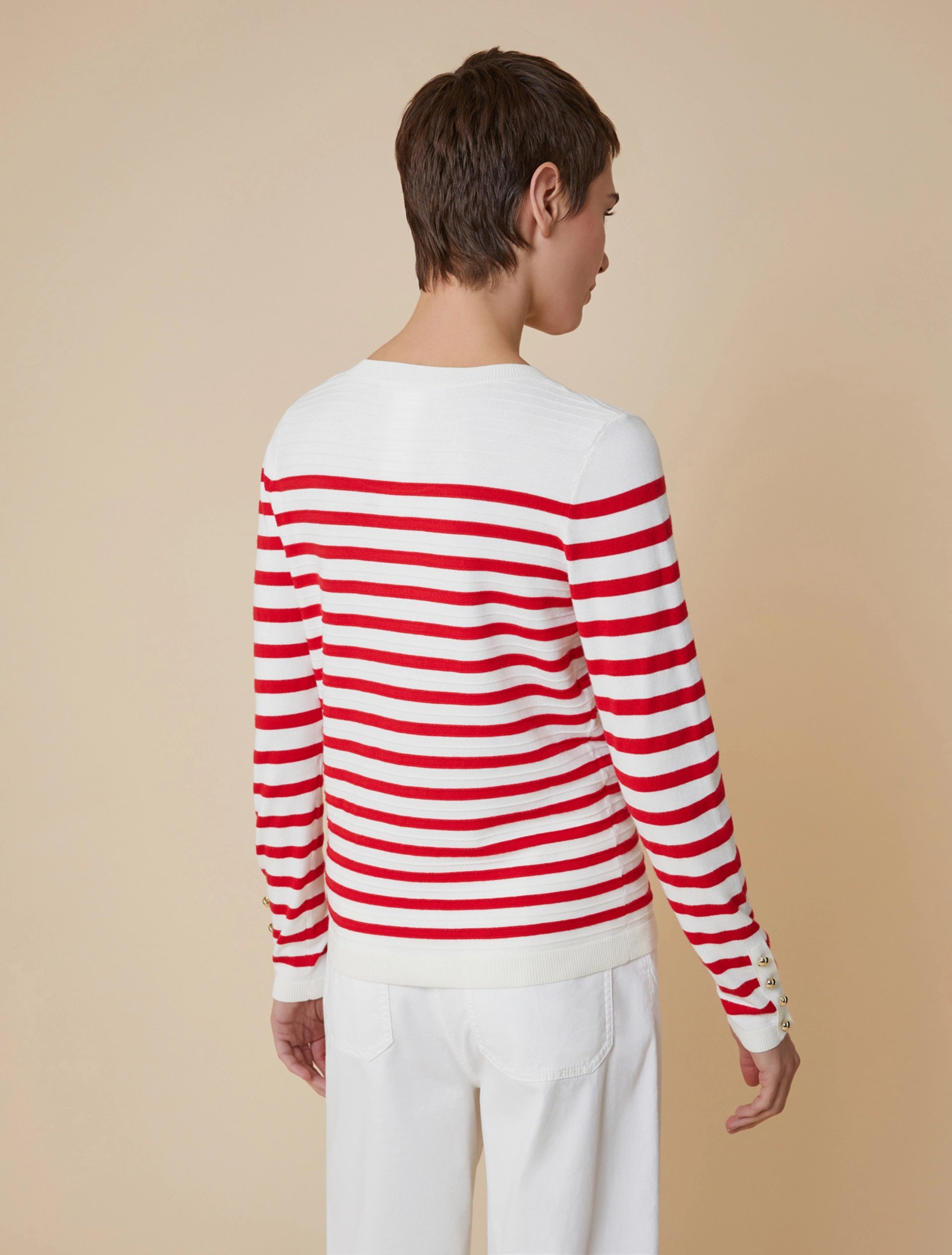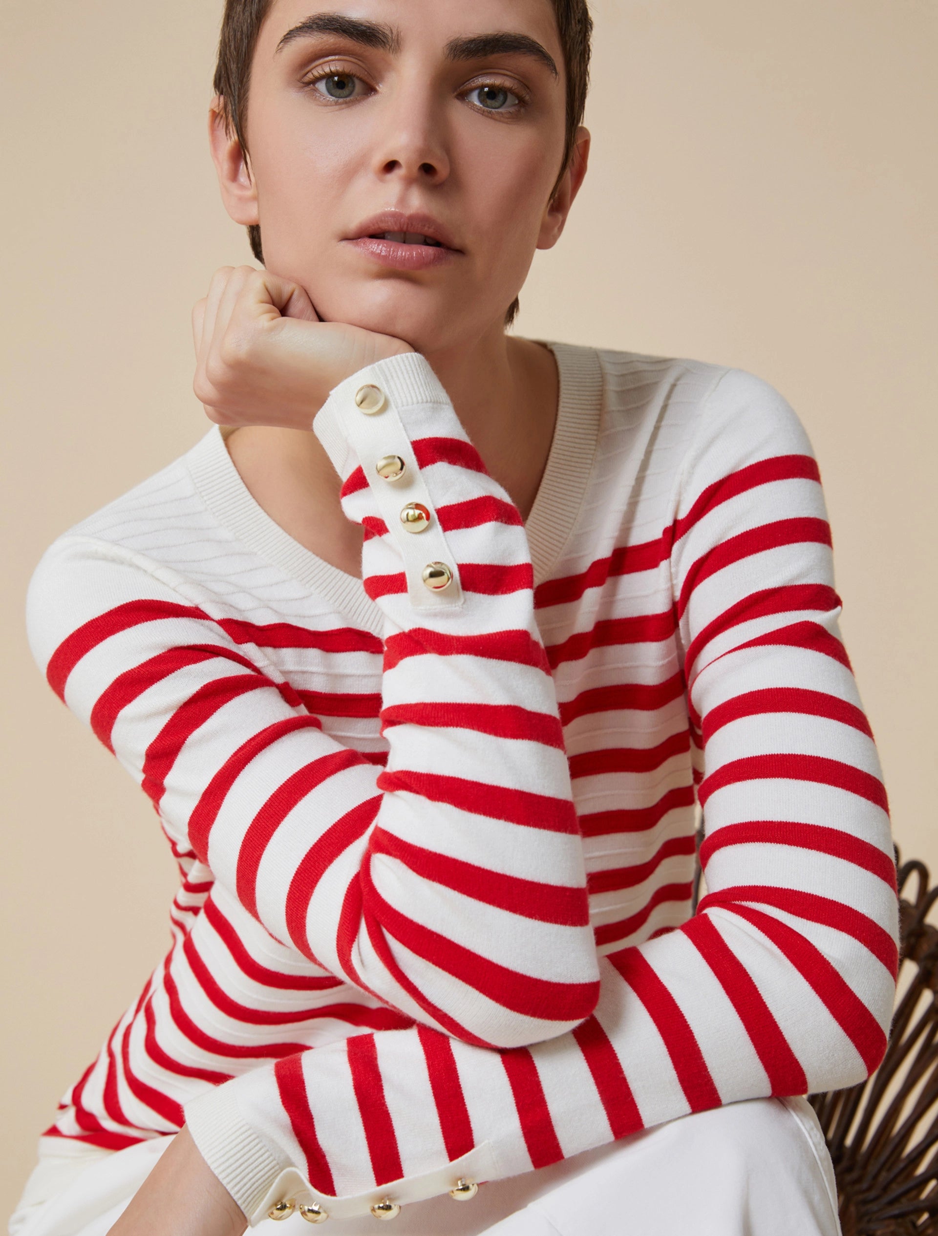 L’intramontabile maglia a righe marinière è sempre una certezza: ovunque vada, porta la freschezza di una giornata en plein air.
